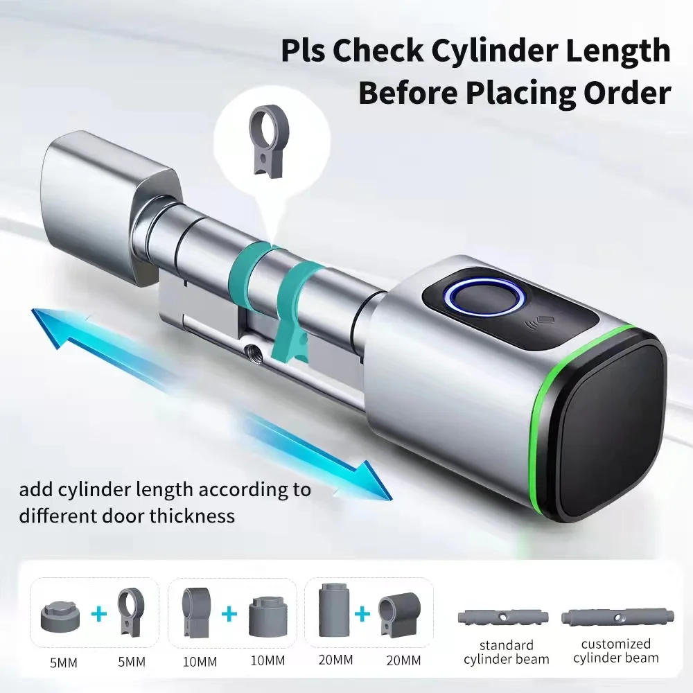 This smart lock cylinder is built with high-grade metal, offering long-term durability and a polished modern aesthetic. It’s compatible with Euro-profile doors and features an adjustable cylinder length, making it suitable for various door thicknesses.